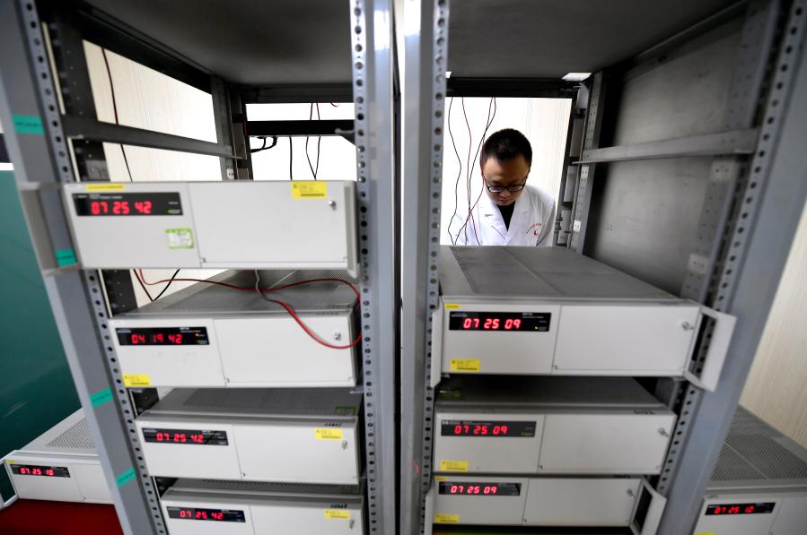 中科院国家授时中心工作人员正在一组铯原子钟前工作。刘潇摄