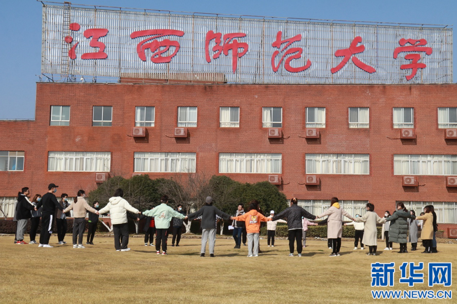 受疫情影响,今年寒假不少学生选择“就地过年”“留校过年”。在江西师范大学,40名留校过年学生组成了“临时班级”,共同度过这个不一样的春节假期。图为留校学生在校园内进行户外拓展活动。新华网发 赖江华 摄