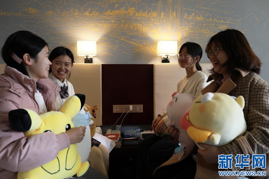 王馨汇是江西师范大学文旅学院大二学生,也是寒假“临时班级”的班长。受疫情影响, 家在黑龙江哈尔滨的王馨汇选择留校,这也是她第一次在异地过年。图为王馨汇(右一)和同学们在房间内聊天。新华网 王凯丰 摄