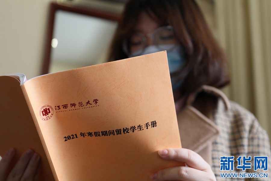 为方便寒假留校学生的教育管理和日常生活,学校制订并发放《2021年寒假期间留校学生手册》。图为王馨汇正在查看手册内容。新华网 王凯丰 摄