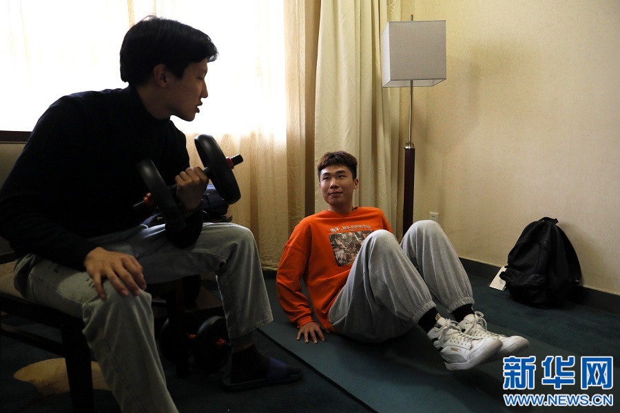 寒假期间,张亦哲和“临时班级”的同学们住进了学校统一安排、免费提供的“双人宿舍”。图为张亦哲和室友在房间内锻炼身体。新华网 王凯丰 摄