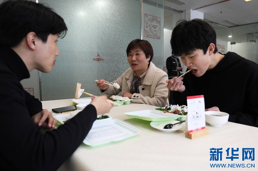 李海红是学校留校学生“临时班级”的班主任,寒假期间,学校每天都安排了值班老师和同学们一起吃住,方便帮助同学们解决遇到的困难。图为李海红和学生们在一起吃饭聊天。新华网 王凯丰 摄