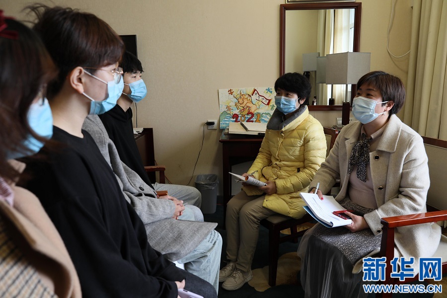 李海红和家人商量决定今年和学生们一起留校过年。图为李海红正在和留校同学们聊天,了解学习生活情况。新华网 王凯丰 摄