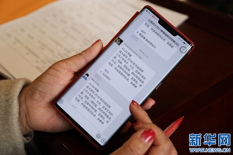 此外,李海红还建立了“临时班级”群,每天发布各类信息,尽力做好服务保障工作。图为李海红正在查看班级群发布的信息。新华网 王凯丰 摄