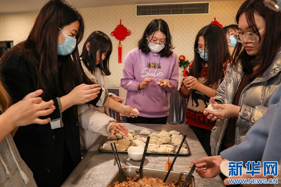 为了让学生们假期不孤单,学校在确保疫情防控安全的基础上,精心策划安排了各种活动,丰富留校生活。图为“临时班级”的同学们正在进行包饺子比赛。新华网发 赖江华 摄