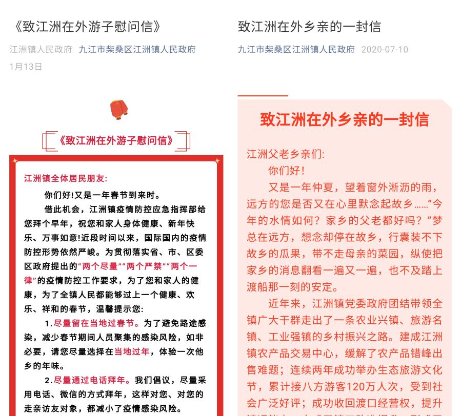 春节前,江西省九江市柴桑区江洲镇人民政府发布的一封《致江洲在外游子慰问信》再度在朋友圈刷屏,信中号召江洲镇在外工作人员尽量在当地过春节,一大批江洲青年选择在外过年。