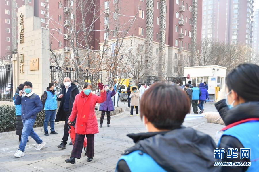 2月10日,居民走出解除封闭管控的大兴区融汇社区时向防疫工作人员们致意,表示感谢。新华社记者 孙瑞博 摄