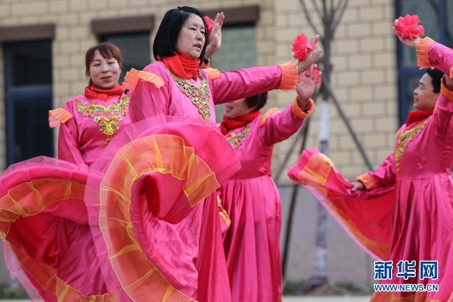 边庆红(左二)参加居民艺术团的排练,为春节期间给乡亲们表演做准备(2月5日摄)。新华社记者 朱峥 摄
