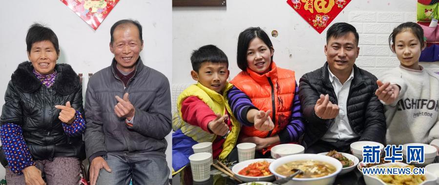 拼版照片:左图为2月9日,魏闯来的父母在湖北孝感家中“比心”(毛峰摄);右图为2月9日,魏闯来(右二)与妻子、孩子在北京的家中“比心”(新华社记者彭子洋摄)。