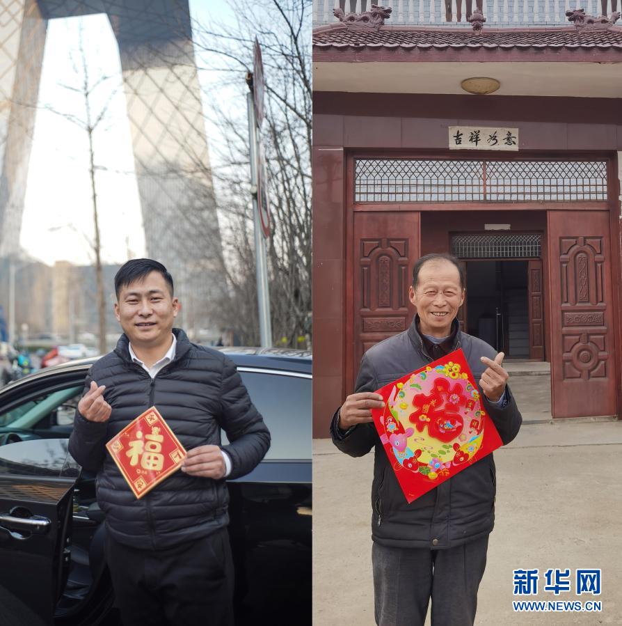 拼版照片:左图为2月9日,魏闯来在北京为父亲“比心”(新华社记者彭子洋摄),右图为2月9日,魏闯来的父亲在湖北孝感为儿子“比心”(毛峰摄)。新华社发