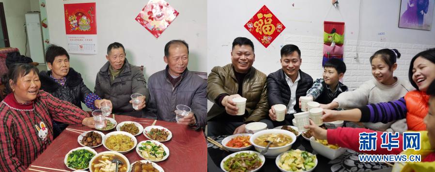 拼版照片:左图为2月9日,魏闯来的父母(右一、右三)及伯父伯母在家中举杯(毛峰摄);右图为2月9日,魏闯来(左二)在北京的家中举杯(新华社记者彭子洋摄)。新华社发
