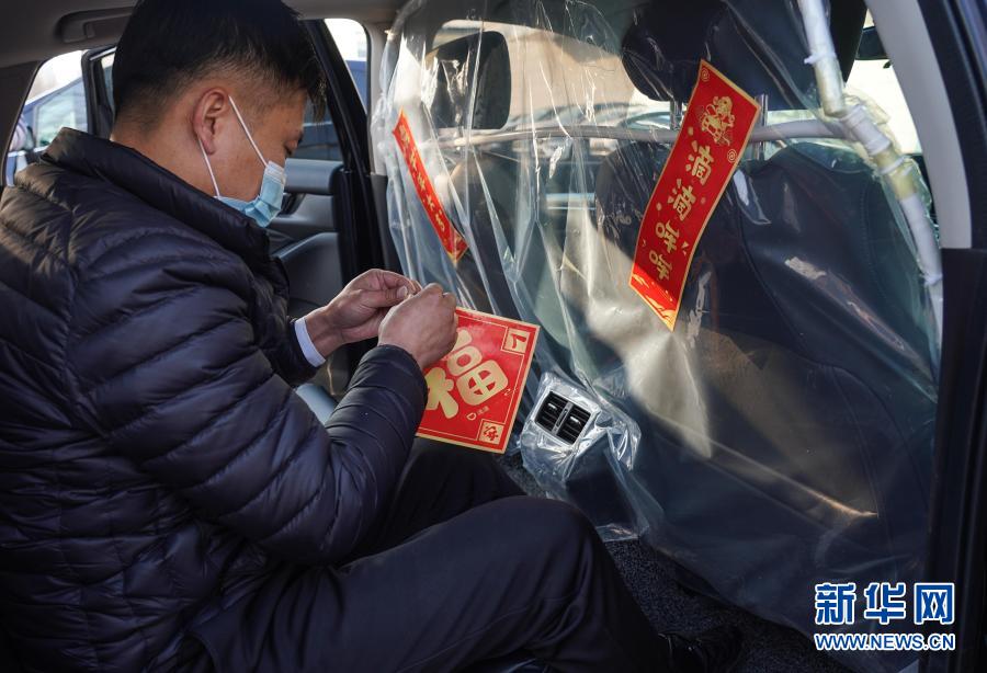 2月9日,魏闯来在车内贴福字。新华社记者 彭子洋 摄