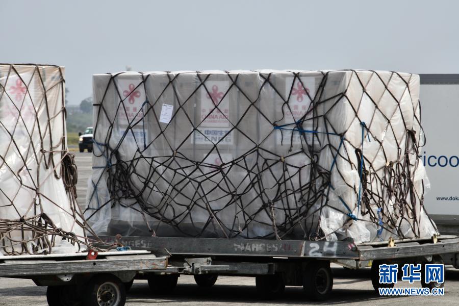 当日,赤几工作人员从专机上卸载这批疫苗。疫苗包装箱上贴有“中国援助”标识、中国和赤几国旗以及“兄弟同心,并肩战疫”的中文和西班牙文标语。
