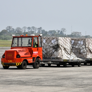 2月10日,在赤道几内亚马拉博,工作人员在机场转运中国新冠疫苗。新华社发(李博远摄)