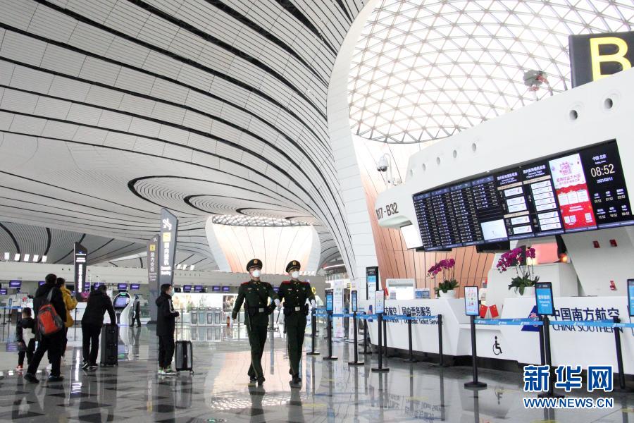 2月11日,武警北京总队执勤第十五支队官兵在北京大兴国际机场巡逻执勤。 新华社发(高栋 摄)