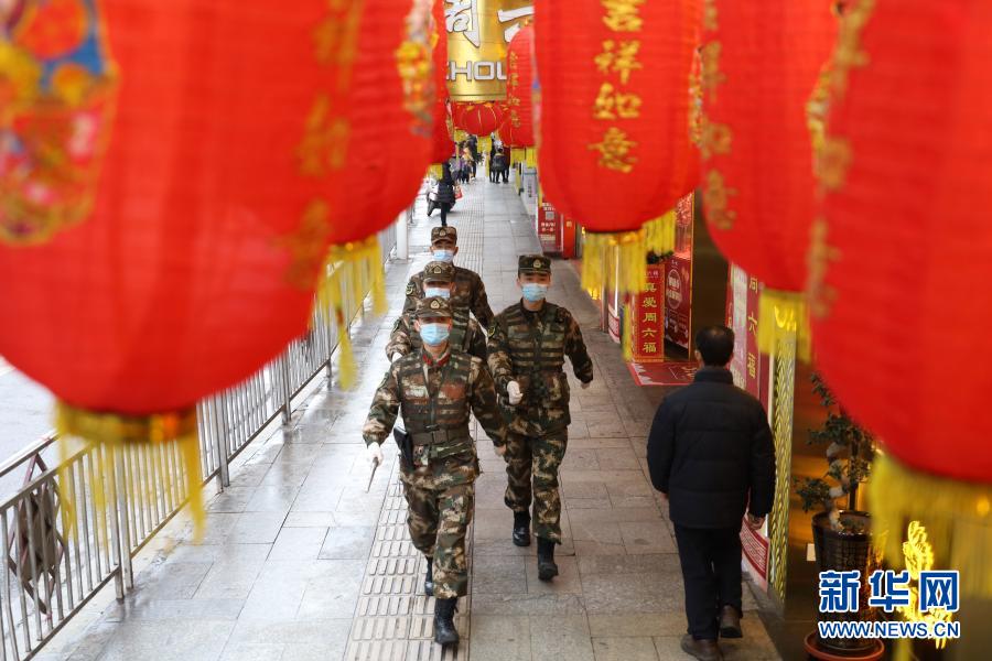 2月11日,武警湖南总队衡阳支队官兵在衡阳解放路巡逻执勤。 新华社发(范一凡 摄)