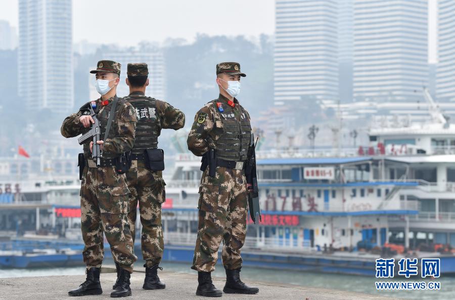 2月11日,武警重庆总队执勤第二支队官兵在重庆朝天门码头执勤。 新华社发(唐志勇 摄)