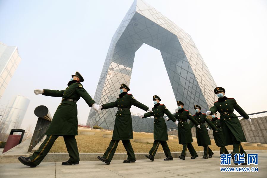 2月11日,武警北京总队执勤四支队官兵在中央广播电视总台(光华路办公区)巡逻执勤。 新华社发(姜润邈 摄)