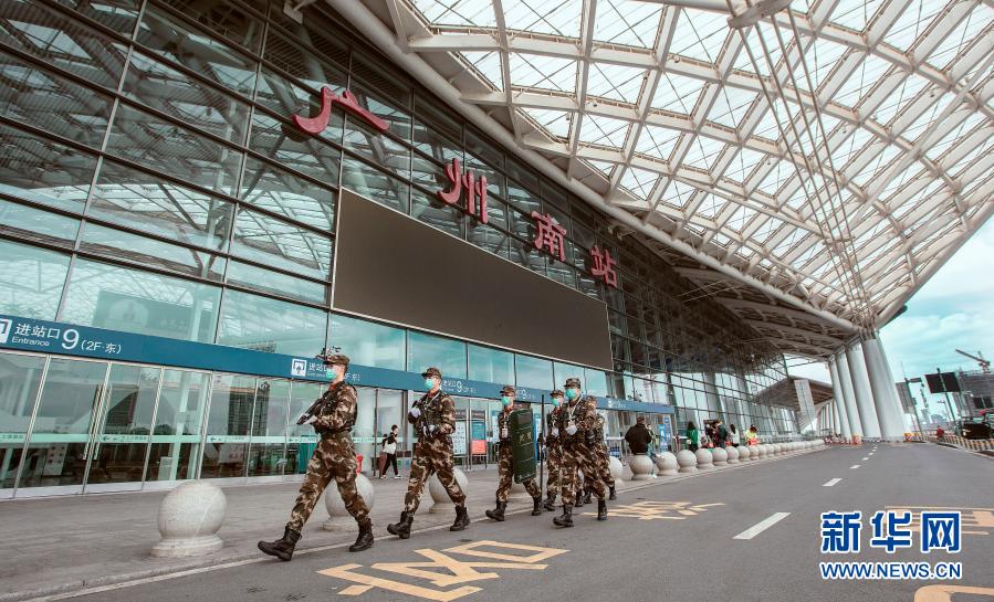 2月11日,武警广东总队广州支队官兵在广州南站巡逻执勤。 新华社发(程长英 摄)
