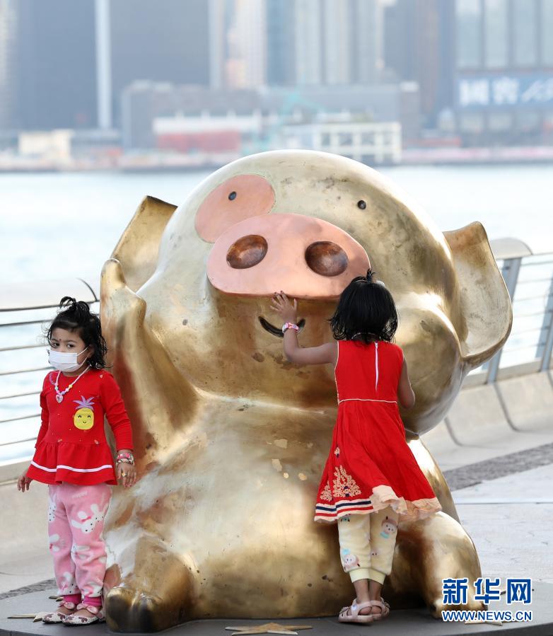 2月12日,在香港星光大道,小朋友戴口罩玩耍。新华社记者 李钢 摄