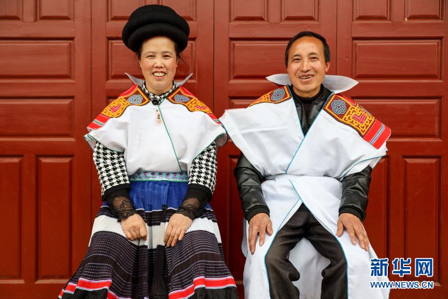 2月11日,苗族村民马雍与妻子黄国琴一起在新居前合影。