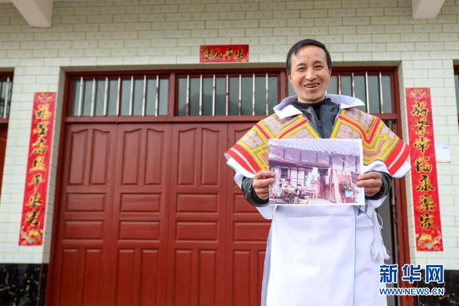 2月10日,苗族村民马雍在新房子门口展示旧宅的图片。2019年11月,马雍获得农村危房改造补贴建造并搬入新居。新华社记者 欧东衢 摄