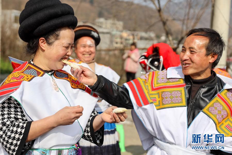 2月10日,苗族村民马雍喂妻子黄国琴吃刚做好的糍粑。新华社记者 欧东衢 摄