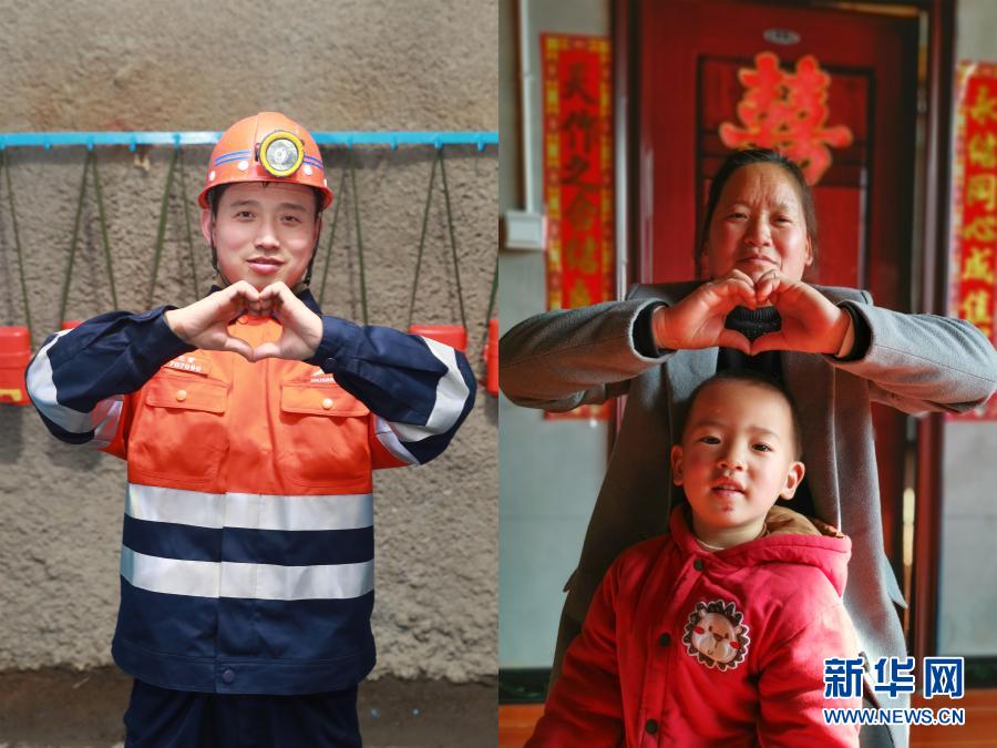 拼版照片:左图为2月11日除夕,陈林在矿井下向远在四川的亲人比心(新华社记者 杜哲宇 摄);右图为2月12日,陈林的母亲和陈林的小儿子在四川阆中家中向陈林比心(受访者供图)。