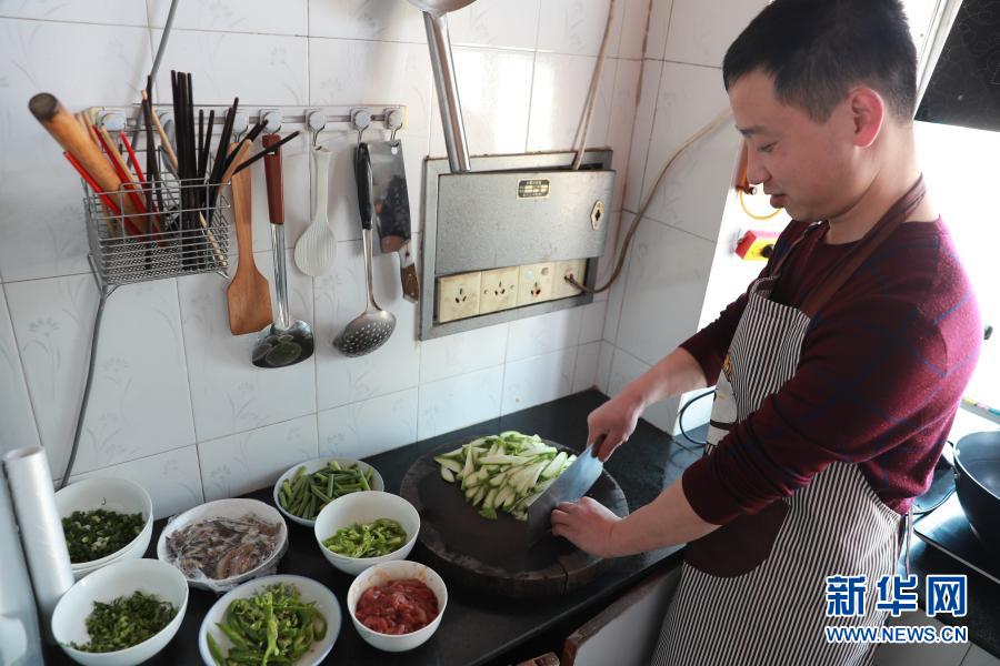 2月12日,陈林在家给妻子孩子做饭。新华社记者 杜哲宇 摄