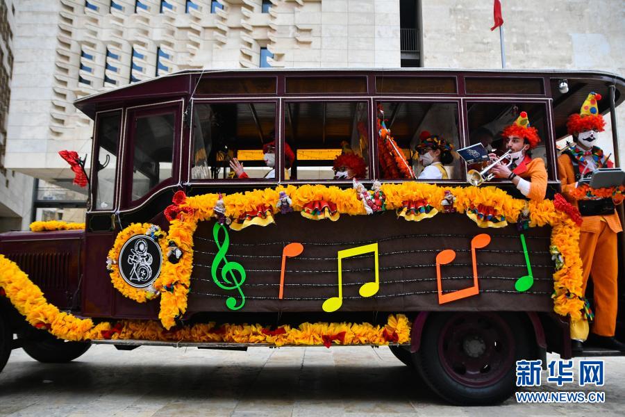 2月13日,装扮成小丑的表演者在马耳他首都瓦莱塔街头乘车巡游。新华社发(乔纳森·博格 摄)