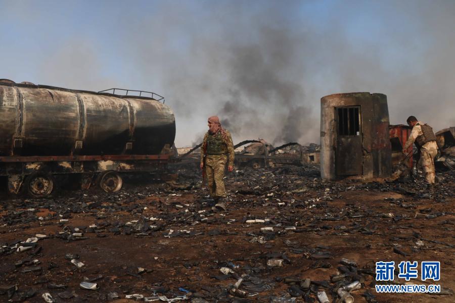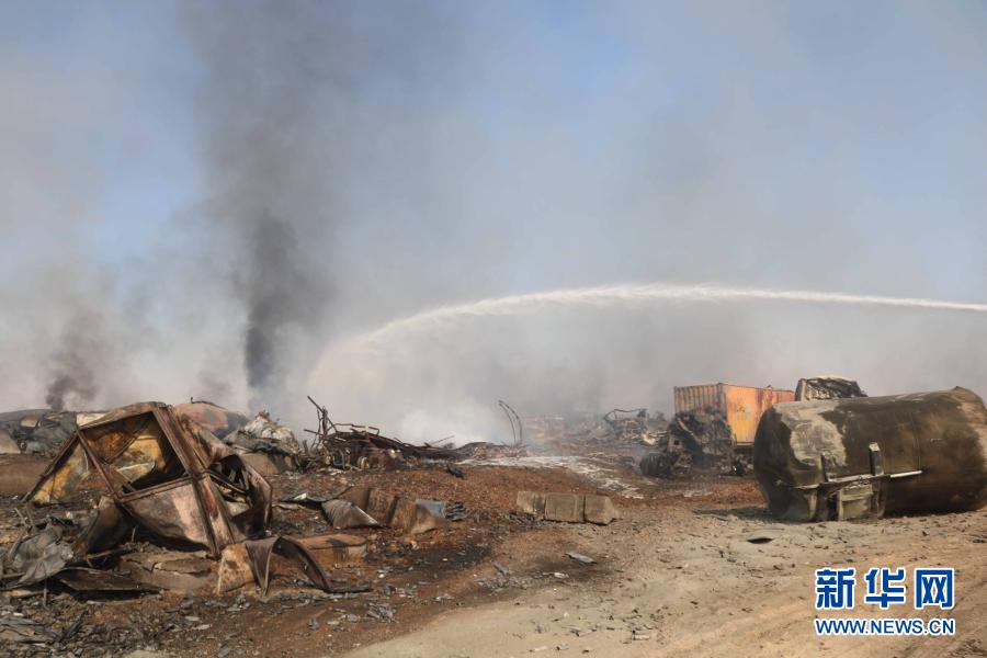 这是2月14日在阿富汗赫拉特省伊斯兰堡口岸火灾事故现场拍摄的油罐车残骸。新华社发