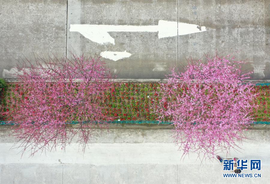 浙江景宁畲族自治县街头梅花盛开(2月14日摄,无人机照片)。新华社发(李肃人 摄)