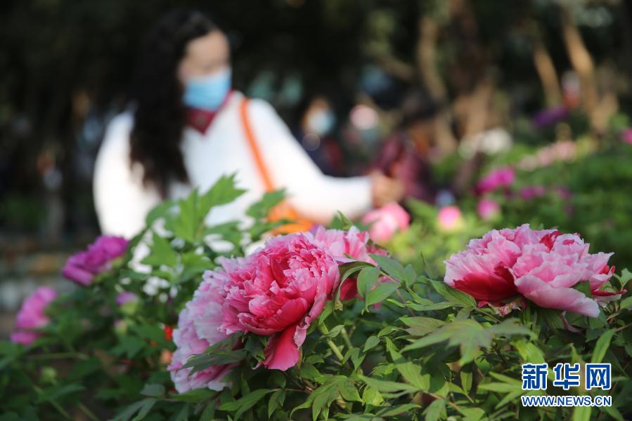 2月14日,游客在昆明市大观公园观赏盛开的牡丹。新华社发(梁志强 摄)