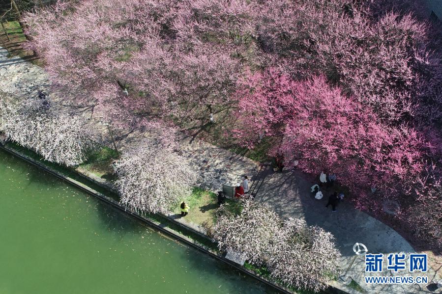 2月14日,在湖南省湘西土家族苗族自治州吉首大学,市民在梅园里赏花(无人机照片)。新华社发(彭彪 摄)