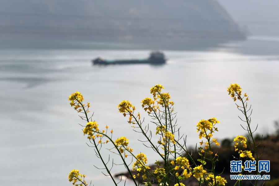 2月14日,货轮行驶在长江湖北省秭归县江段,岸边的油菜花吐露芬芳。新华社发(王辉富 摄)
