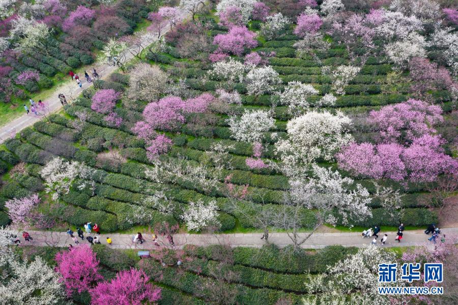 2月14日,游人在南京梅花山赏花(无人机照片)。新华社发(苏阳 摄)