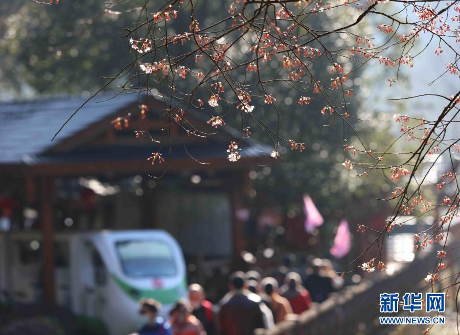 2月14日,游客在湖南张家界武陵源景区十里画廊观赏樱花。新华社发(吴勇兵 摄)