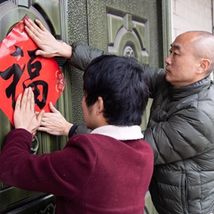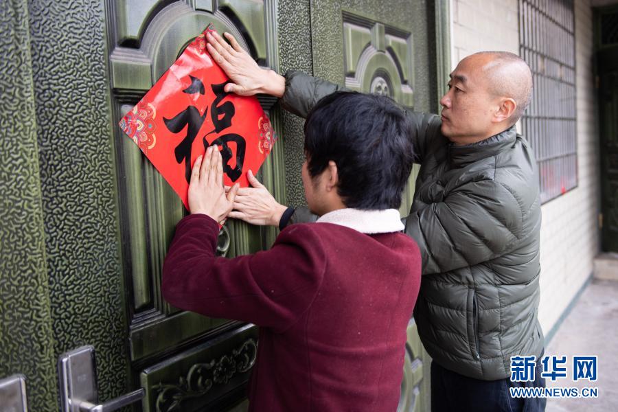 在湖南省湘西土家族苗族自治州永顺县石堤镇团结村,村民李明友(左)和扶贫干部一起贴福字(2月6日摄)。新华社记者 陈思汗 摄