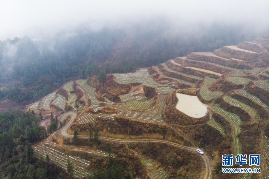 这是2月4日在湖南省湘西土家族苗族自治州花垣县民乐镇梳子山村拍摄的一处茶园(无人机照片)。新华社记者 陈思汗 摄
