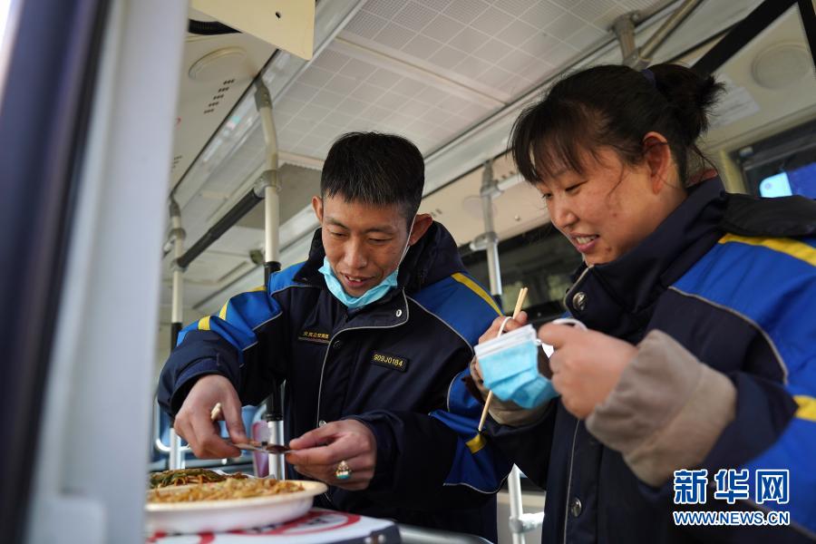 在地铁建国门站,姜楠(左)和柴丽莉在公交车上一起吃午饭(2月10日摄)。新华社记者 鞠焕宗 摄