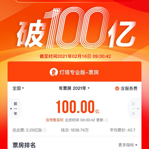 据灯塔实时数据,截至2月16日上午9时30分,中国电影市场2021年度总票房(含预售)突破100亿元,总观影人次达2.29亿,总场次1638.74万。