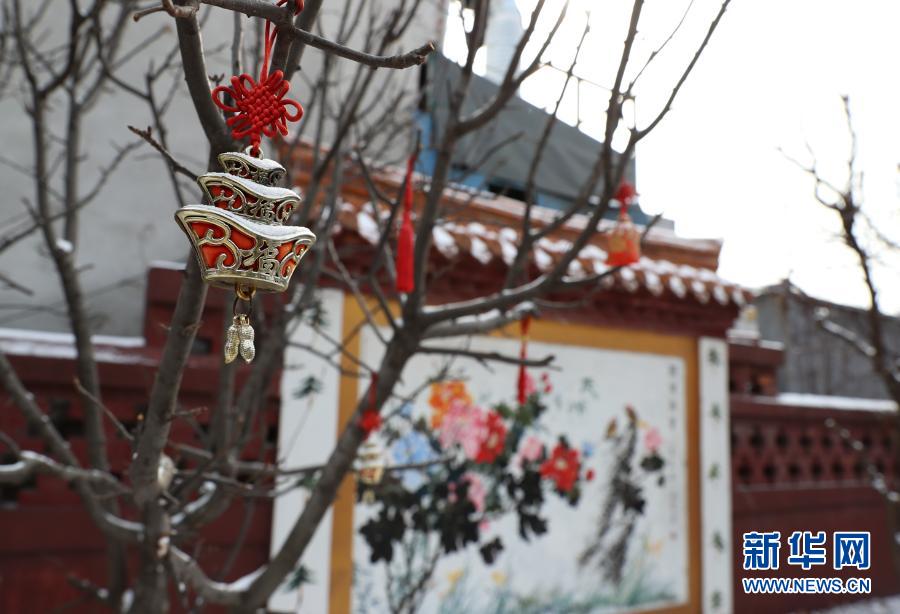 2月16日,韩国仁川中华街一处传统院落内的树上挂着中式祈福饰品。