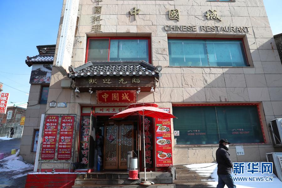 2月16日,一名男子从韩国仁川中华街内的一家中餐馆门口经过。