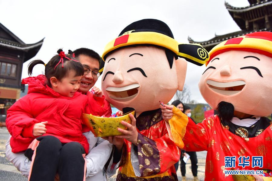 2月16日,在贵州省黔东南苗族侗族自治州丹寨县万达小镇景区,“财神”向游客送糖送祝福。
