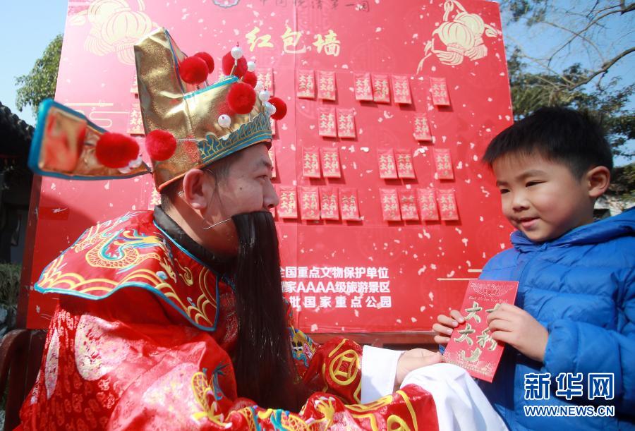 2月16日,在江苏省扬州市何园景区,“财神”向游客发红包。