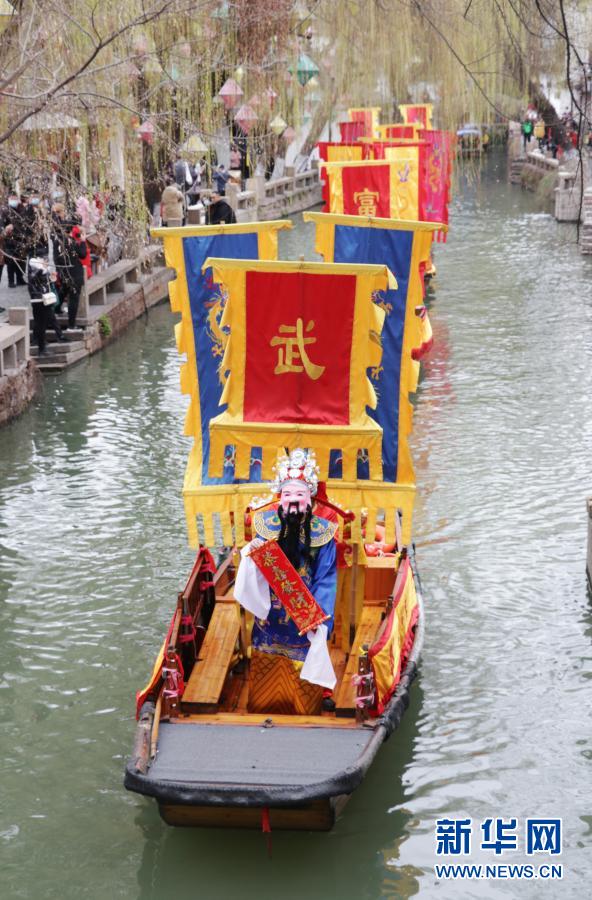 2月16日,在江苏省苏州市周庄古镇举行的水上“迎财神”民俗表演活动中,“财神”向沿街游客送上祝福。