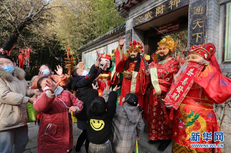 2月16日,在山东省临沂市沂南县铜井镇竹泉村财神庙前,“财神”为游客送福。