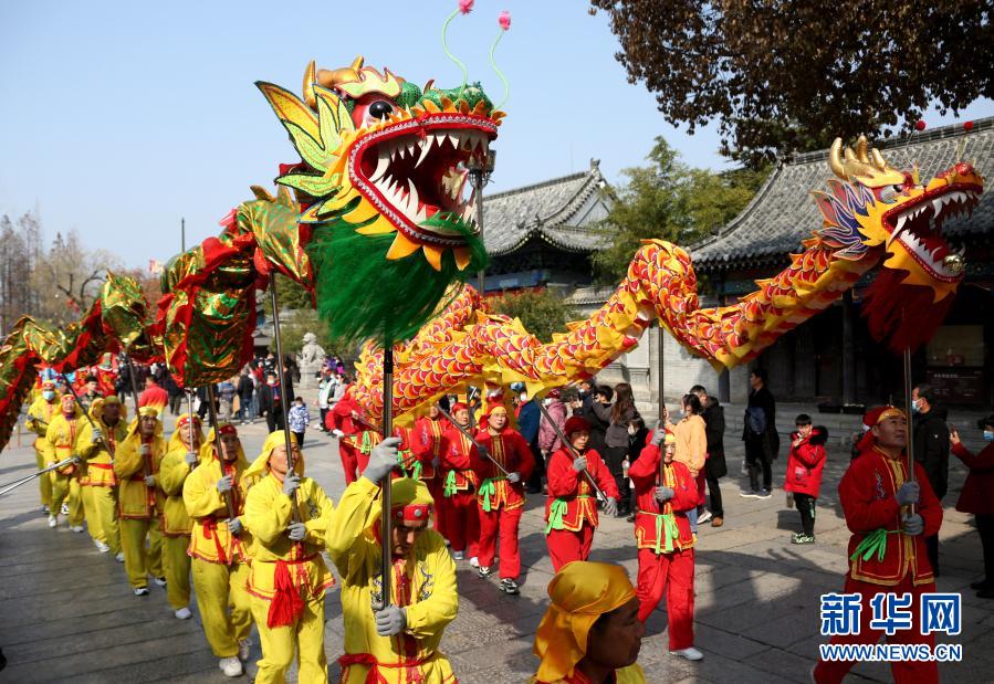 2月16日,游客在京杭大运河畔的山东省枣庄市台儿庄古城观看社火巡游表演。