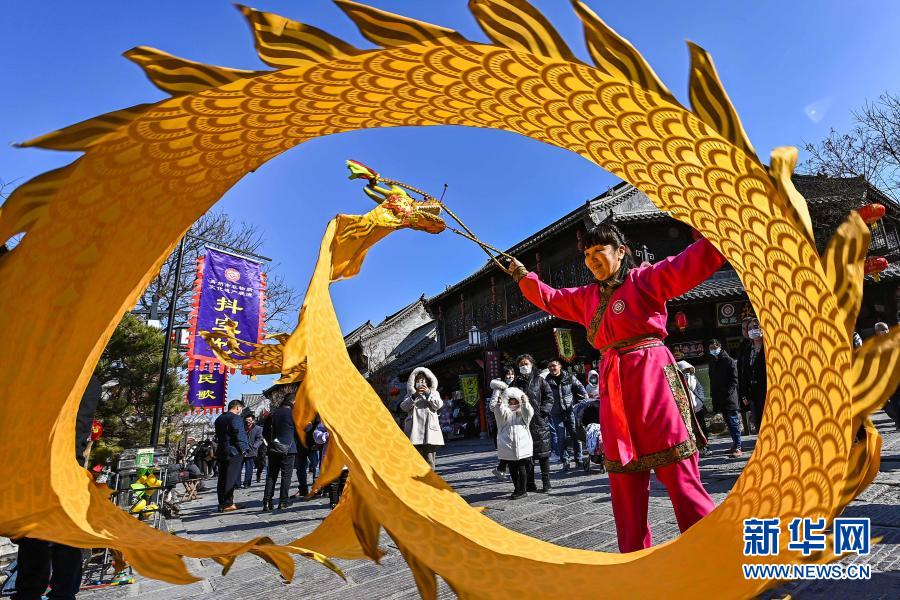 2月16日,民间艺人在山东省青州古城景区表演“空竹中国龙”。