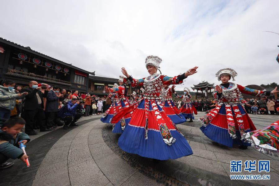 2月16日,在贵州省黔东南苗族侗族自治州丹寨县万达小镇景区,苗族同胞为游客表演苗族踩鼓舞。